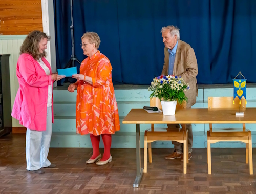 Rouva Eeva Ahtisaarelle annettiin kiitokseksi Karjalohjan vaakuna-standaari.