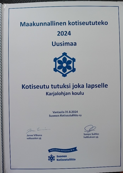 Kotiseutuliittokin on huomannut monivuotisen yhteistyömme ja palkitsi koulun vuoden Uusmaalainen kotiseututeko -palkinnolla.